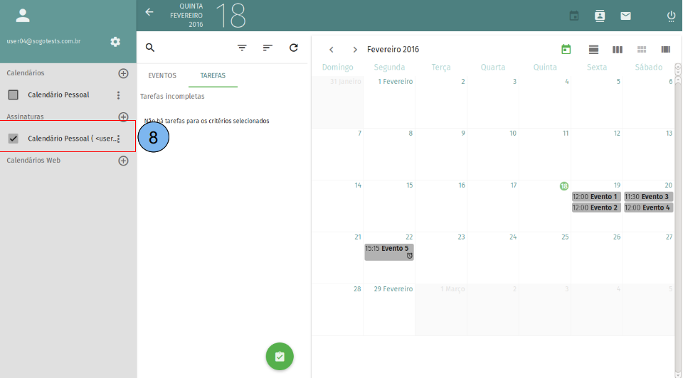 Na conta para onde o calendário foi compartilhado (8), veja que o calendário já aparece para o usuário (9), ao selecionar o calendário em questão é possível acessar os eventos e tarefas do mesmo (10).