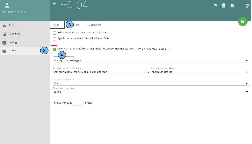 Em seguida “Correio”(2) -> “Geral”(3): Marque a opção “Ao enviar e-mail, adicionar destinatários desconhecidos ao meu “livro de endereço pessoal”.