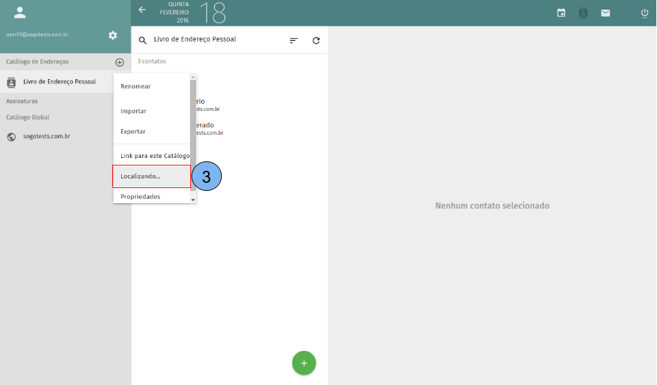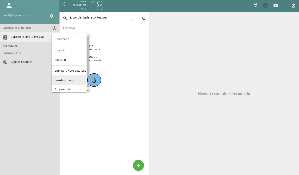 São as permissões que um determinado usuário do domínio terá ao seu catálogo de endereços. (1)Acesse Catálogo. (2)Em seguida acesse o menu do catálogo.