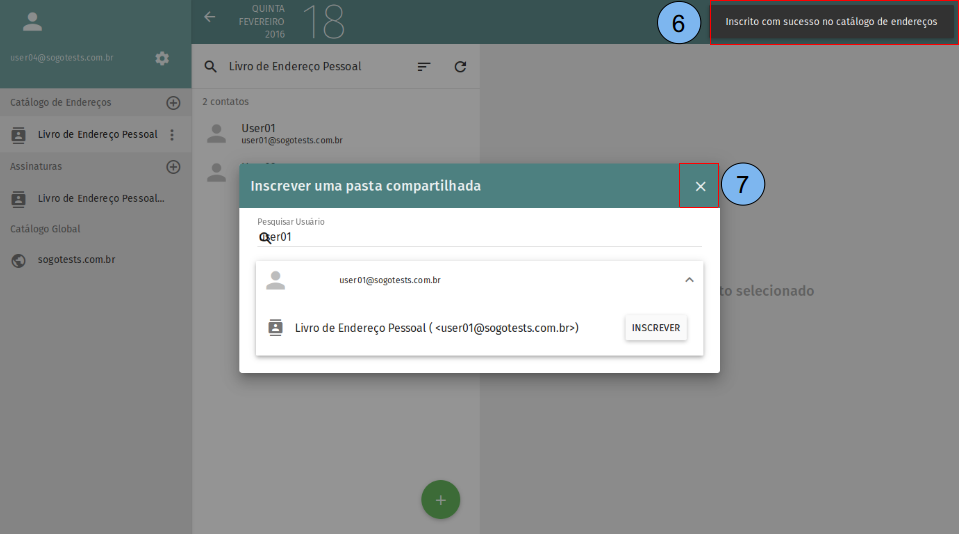 (6) Após clicar em “Inscrever” no passo anterior vai aparecer a mensagem “Inscrito com sucesso no catálogo de endereços”. (7) Clique em fechar (x).