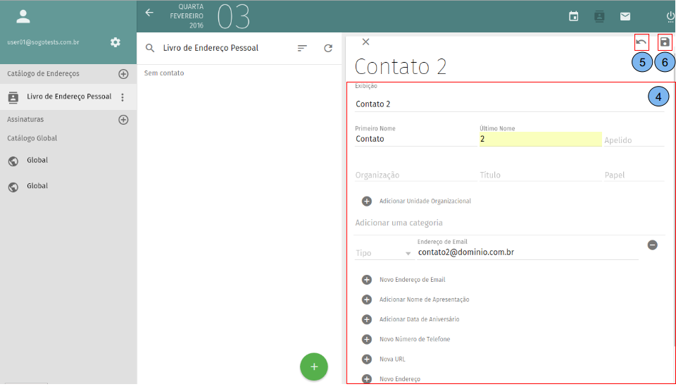(4)Insira os dados do novo contato. (5)Caso seja necessário é possível desfazer tudo que foi digitado. (6)Se os dados estiverem corretos clique no botão “Salvar”.