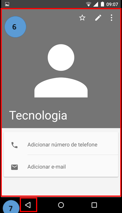 Na próxima tela será apresentado o contato já criado (6), clique em voltar para ir para a tela principal de contatos (7).