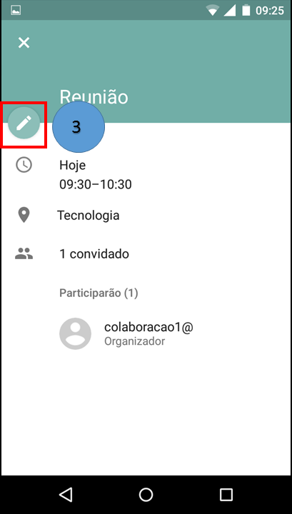 Após ter salvo as alterações o aplicativo mostrará a tela com os detalhes do evento assim como os seus convidados (8), clique em voltar (9) para ir para a tela inicial do aplicativo “Agenda” (9).