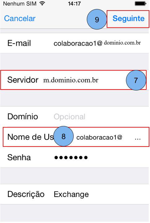Na próxima tela preencha o nome do servidor (7), insira a conta novamente (8) e clique em “Seguinte” (9).