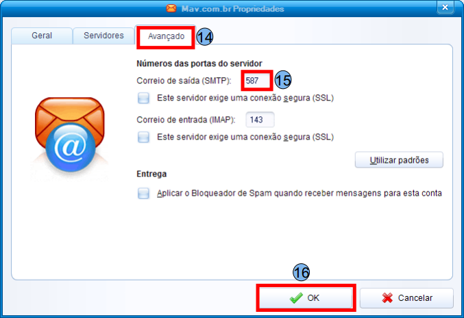 Na aba “Avançado” (14), verifique se as configurações estão de acordo. Em “Correio de saída (SMTP)” (15), digite “587”, após procedimentos, clique em “Ok” (16) e sua conta estará configurada e pronta para uso.