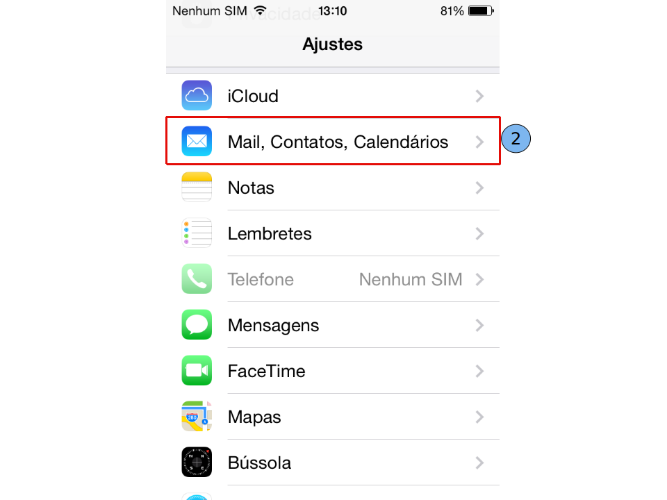 Selecione "Mail, Contatos, Calendários" (2).