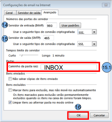 Na aba Avançado altere a porta na opção Servidor de entrada IMAP (14) para 993