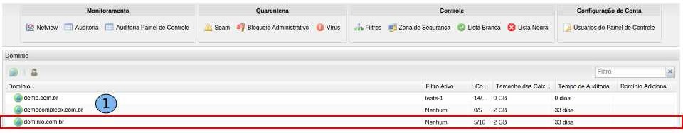 Ao acessar a “Página Inicial” do painel de controle, dê um duplo clique no domínio “dominio.com.br” (1).