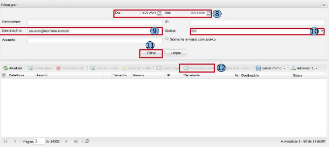 Guia “Destinatário” (9) - adicione a conta de e-mail que deseja recuperar os e-mails. Guia “Status” (10) - neste campo, você pode adicionar qual status “OK” e clique em “Filtrar” (11)