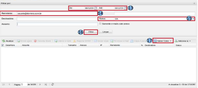 Guia “Remetente” (14) - adicione a conta de e-mail que deseja recuperar os e-mail enviados pela mesma. Guia “Status” (15) - neste campo, você pode adicionar o status “OK” e clique em “Filtrar”(16).