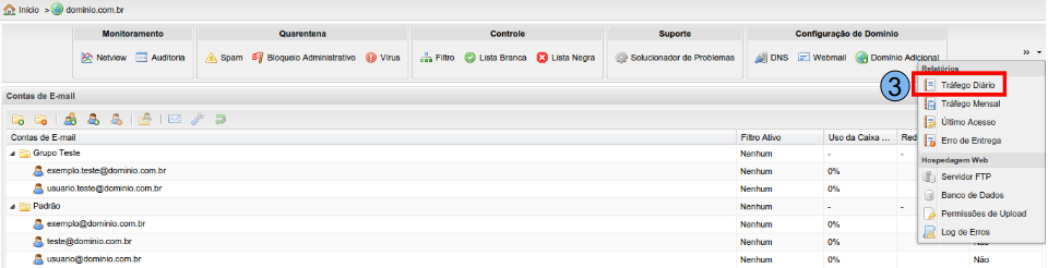 Para iniciar o processo de visualização do relatório de tráfego diário de e-mails, na tela inicial do Painel de Controle, localize o domínio desejado, neste caso, será utilizado “domínio.com.br” (1), clique duas vezes sobre o mesmo.