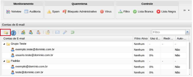 Na guia “Contas de E-mail” clique no ícone “Adicionar Grupo” (2).